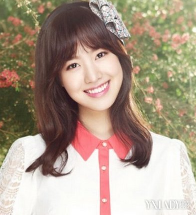 纯真的笑容,一款韩系的中长微卷发,显得半圆形的贴服头发,对国字脸起到了很好的修饰效果,拨开一角的齐刘海佩戴精美发箍,呈现出简单而又淡雅的气质。