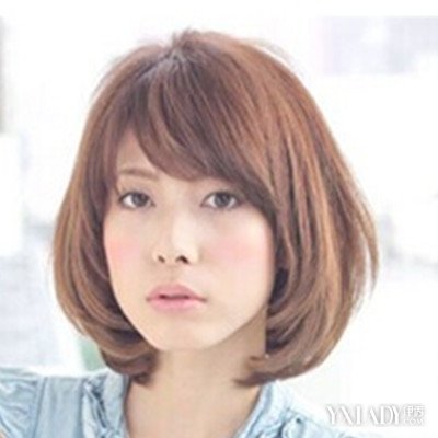 可爱俏皮的圆脸短发,厚实齐整的侧发,向内卷翘的发尾,使得脸型显得圆润立体,微卷整齐的侧刘海,可爱度爆增,整体的搭配,让圆脸变得十分可爱。