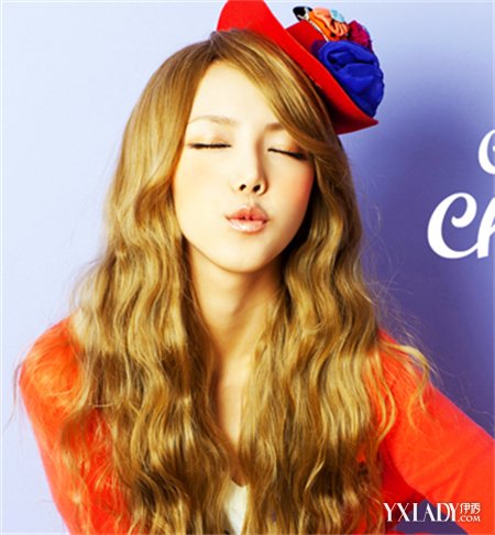 亮眼的发色显露出个性与时尚的一面,斜刘海发型显得为更为有气质,时尚的麦穗烫发菜打造出的长卷发造型搭配上发饰的小礼帽颇显时尚达人的一面