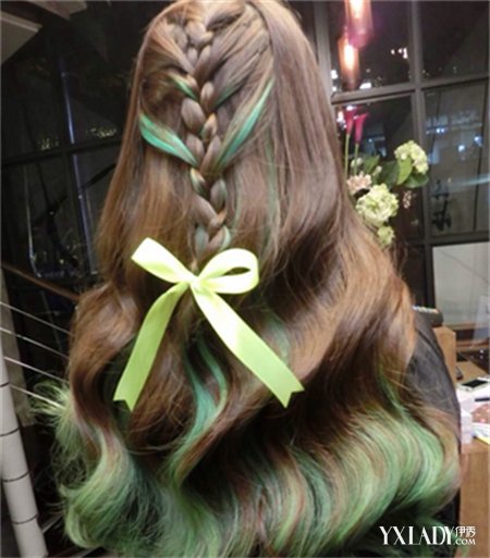 这款在棕黄色的发色的基础上,挑染着深绿与浅绿的发色,独特别致,脑后的编发效果也是十分的抢镜的哦。