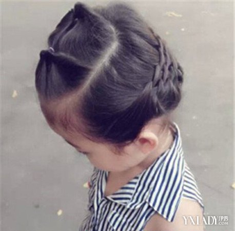 4、十分清爽可爱的一款女童发型扎法,我们可以很清楚地看到编发发型的精致轮廓,打造出别致的时尚俏皮感,很是惹人爱。