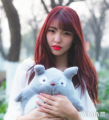 蓬松的中长发烫发发型,超显眼的 一款酒红色头发不仅有时尚感而且颇有气质,加上甜美的空刘海勾勒出无比的唯美来。