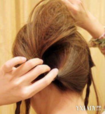 STEP6.盘头发扎包包头把头发梳澎之后,拉住马尾尾端,将整坨头发盘绕在一起,用黑色发夹固定发尾末端。小编提醒:此步骤就是在头部侧边下方绑个包包头啦。