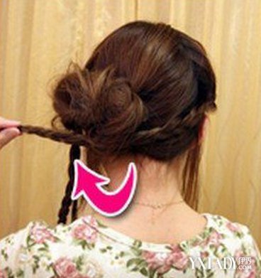 STEP7.将一边辫子,缠绕在包包头上a.抓住辫子尾端,先将辫子绕过包包头下方,接着将辫子缠绕在包包头的固定处。b.接着上一步,将辫子绕到不能绕为止,把辫子用黑色发夹固定。