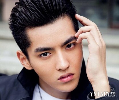 在短发发型的基础上有所改造的,两侧短,中间稍微有点长,最吸睛的就是额头上的蓬松上翘的造型,刚毅的额头,搭配个性的墨镜,帅气的脸型,突显90后时尚潮男范。