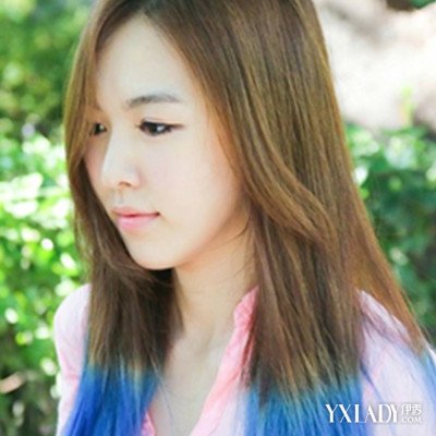 很是清爽靓丽的一款韩式挑染发发型,侧分的长直发搭配浅棕色与海蓝色的双色挑染,时尚个性的染发很有减龄的效果。