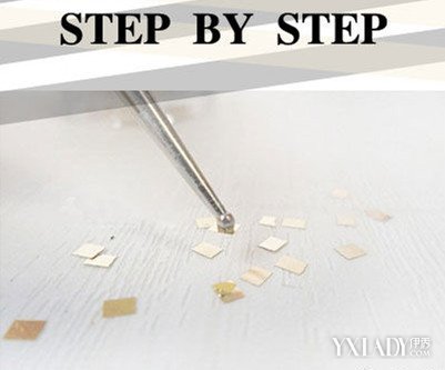 用点钻笔蘸取透明甲油,然后黏上来一个方片。