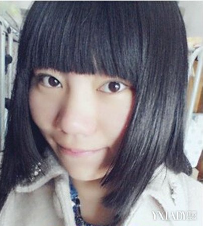 这是一位大脸的女生,选择的是一款直发型的齐刘海的姬发式的发型,纯黑的头发,头发特别的顺直,清纯又大方。