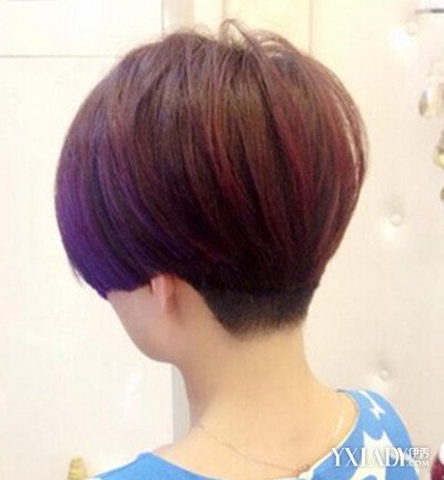 4.这款短发发型的造型非常多见,特别的是将时尚的染发大胆运用,脑后的发色是非常阳光的红咖啡色,使人感觉非常活力四射。刘海处挑染成迷人的亮紫色。一种非常有张力的性感气质,被这款独特的染发衬托得十分完美而前卫。