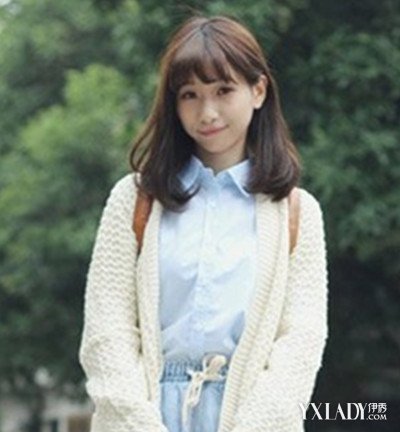 2.空气感刘海搭配内扣的中长卷发,不仅将脸型修饰的很小巧,而且甜美很有气质,再搭配黑色的头发瞬间散发出一种学生时代的气息。