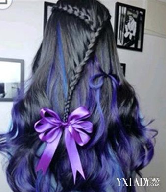 适合烫长卷发的女生尝试的一款简单发型diy,甜美的加股辫编发搭配深紫色系的挑染发设计,很有甜美的公主范儿。