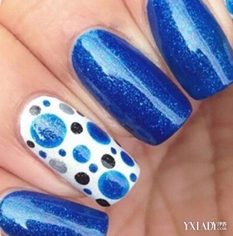 很漂亮的蓝色打底,局部指甲用白色打底,用蓝色灰色和黑色不同大小的圆点点缀,成熟的蓝色不会显得太过于幼稚。