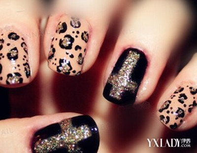 两个手指选用黑色甲油打底,加以闪粉涂抹出的十字架,显得个性另类,另外三只手指则在裸色甲油上画了豹纹图案,更显醒目吸睛。