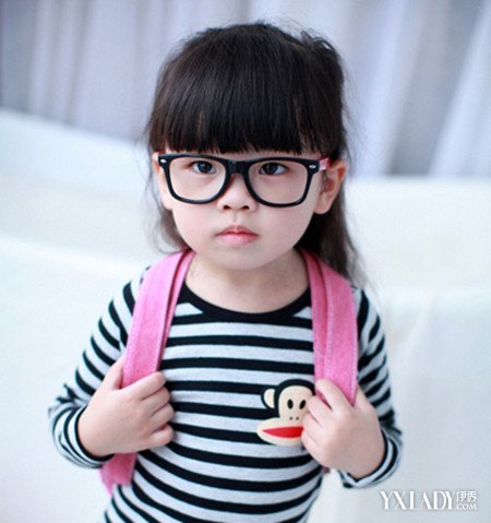 小女孩的公主头扎法,整整齐齐的厚厚刘海,无辜双眼,配搭椭圆眼镜,更活泼可爱。