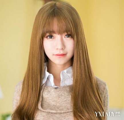 4.女生长长的卷发,染出靓丽的黄棕色,搭配空气感齐刘海,更显妩媚迷人,发尾的卷翘干,动感十足。