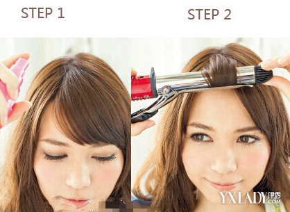 Step2:然后再用卷发棒将刘海弄卷曲,注意卷度要向内。