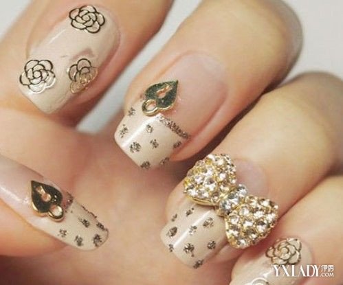 感觉很奢华的一款美甲,满满的金色小饰物,满钻的蝴蝶结看起来女人味十足。