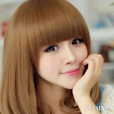 这款可爱范十足的发型,整齐厚重的刘海很好的修饰了女生精致的小脸,一头棕黄色的发丝时尚又亮眼,发尾内扣的卷发很是甜美哦。