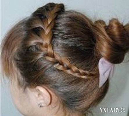 Step3:接着把两条辫子缠绕起来,盘在脑后,用专用的钢丝发卡固定。在固定的时候一定要注意把发尾收进去。这样就完成了!