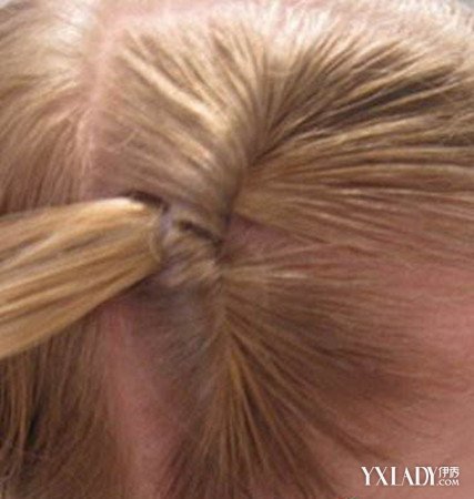 首先要将小女孩头发梳顺,然后在脑侧取出一束头发,用小橡皮筋扎好,接着从发根处挖个小洞,将扎好的小马尾从洞中穿过。