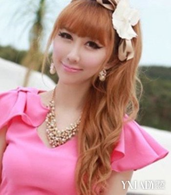 齐刘海侧扎马尾发型:很甜美的长卷发女生,小小的尖下巴搭上漂亮的黄色齐刘海,很是有着漂亮清纯的气质。高扎的秀发有着很蓬松的梳发质感,却丝毫不显凌乱。高扎的侧盘发将长长的卷发斜斜地放在肩上,一朵大大的布制花饰更添甜美气质。