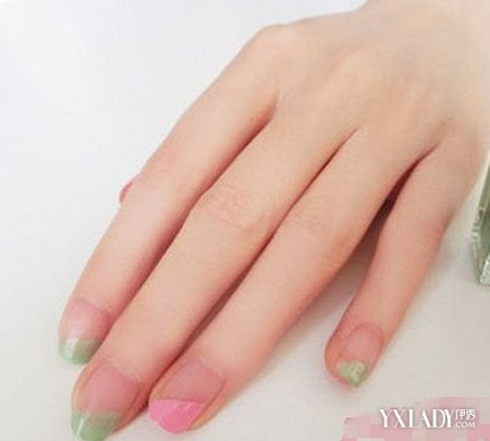 步骤一:显取来粉红色的和田园绿的指甲油,画一半法式斜边。