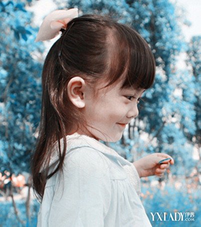 圆脸女孩子,妈妈们可以给宝贝剪个齐刘海,稀疏的可爱中长发,发顶绑个蝴蝶结,俏皮又时尚。