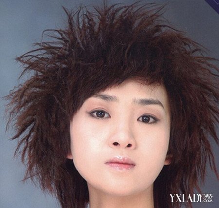发型点评:蓬松十足的锡纸烫短发,超级夸大的爆炸头发型,展现出女士狂野另类的时尚,非常抢眼的发型。
