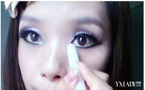 6、拿出黑色的眼线笔,画出眼妆的上眼线和下眼线。沿着睫毛的根部进行描画,记住要画得均匀,不要求太细,稍微粗一点也是可以的,因为那样子能够让眼睛显得更大更有神。