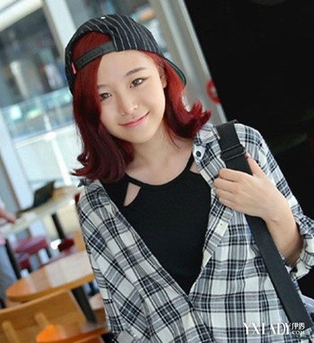 大学生发型设计是很不错的一款,不但有个性而且洋溢着青春范,酒红色发色的气质感与时尚感展现出来,清新靓丽,发尾形成蓬松的外卷特别时尚,搭配上棒球帽与格子衫十分有活力。