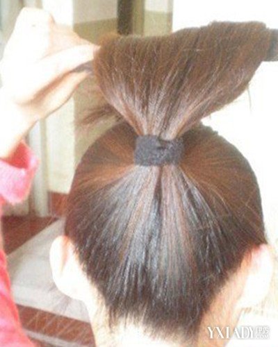 这是扎好光滑马尾后的样子,可以用梳子的尾部将额前的一些发丝稍稍挑出来一些,能将额头修饰的更好看。将刚刚扎好的高马尾,分成均等的两部分,然后将这两部分按交叉的方式将其缠绕编发,如图所示。