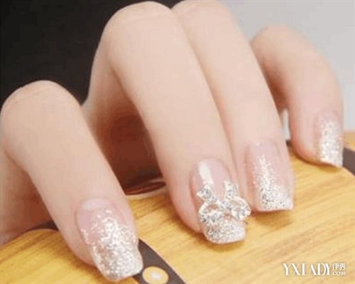 【样式三】粉嫩典雅风:亮粉也可以充满整个指甲,不是水晶指甲才拥有这种质感,只要利用颗粒较大的亮粉指甲油,就可以让指甲马上变身,创造出充满水晶指甲风格的典雅造型。步骤:1.选择一款含有丰富亮粉的指甲油,先刷上两遍,将想拥有的指甲质感做出来。2.再选一只同色系但是亮粉更大、更多的指甲油再刷上一层,增加亮泽感 3.最后可以点缀式的在指甲尾端贴上一点小水钻,马上就将水晶指甲感觉表现的毫无破绽。必备品:1)日本艺术指甲彩饰品。2)晶采指甲油。3)炫耀甲彩。