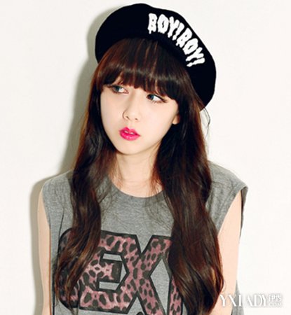 内扣式的甜美平刘海展现出时尚女生的一面,柔顺的长卷发形成别致的气质感,搭配上个性的染发营造出时尚感,帽子拗出造型尽显时尚与潮流。