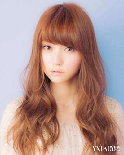 时尚点评:厚重的斜刘海沿着眉毛弧度内扣的这款长卷发,凸显出女生一双迷人的双眼,蓬松感的打造让女生的额头更加饱满,加上棕黄色的染发后就更奢品唯美与妩媚吸睛。