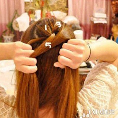 4、开始编发,第一层是变成麻花辫,首先将3股放在2股上面。