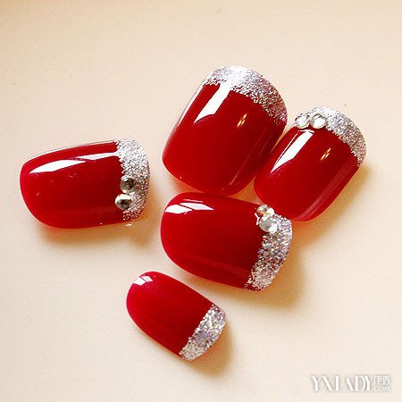 【图】酒红色贴钻美甲图片 妩媚十足永不落伍