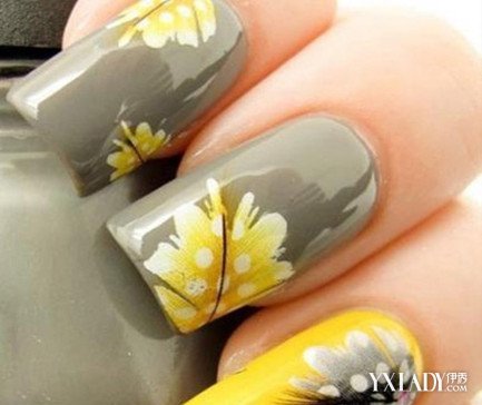 紫色是气质的象征,选用紫色指甲油作为底色,画上银色的花朵,无名指用反色来进行彩绘,不会显得过于单调。