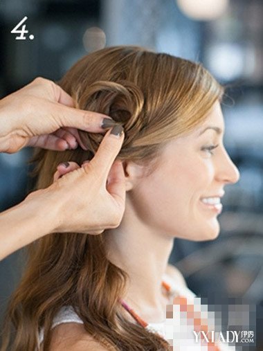 Step4:在耳际上方确定一个轴心,顺时针地向上旋转你编织好的发辫。