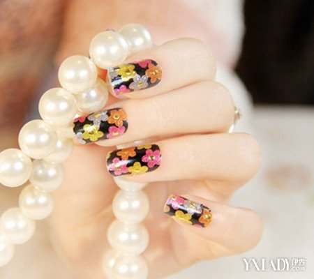 小雏菊的花式图案非常精美,有种小清新的气质,以黑色作为打底背景,缤纷的花朵色彩装点在上面,整体颜色对比度就更加鲜明了,撞色元素设计的美甲贴非常好看。