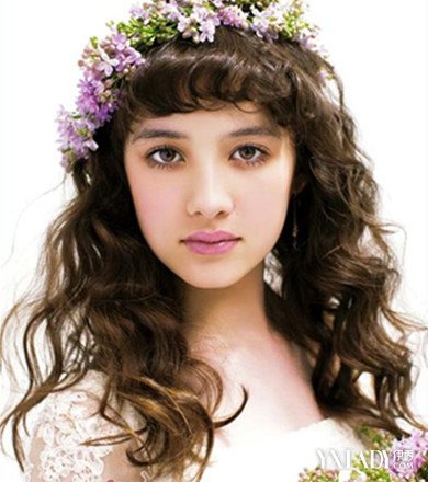 浪漫的卷发,洋娃娃的造型。紫色的小花编织的花环盘于发间,垂在浪漫的发丝上。这样的跟妆造型,仙气十足!紫色的花朵搭配紫色的彩妆,整体化的跟妆造型,会更加整体!