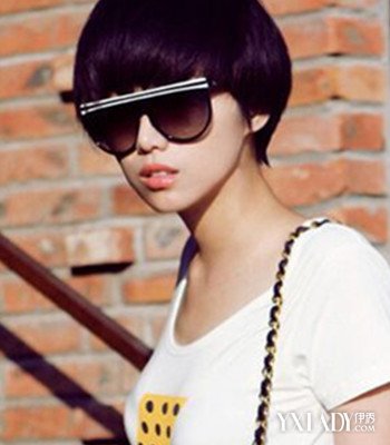 个性的短发波波头加上斜庞克发型的时尚感,搭配起来颇显帅气风,对于女生来说也是特别简单的一款造型, 加上深紫色的染发颜色不仅简单而且颇具时尚感,搭配上墨镜显露出无比的时尚感来。