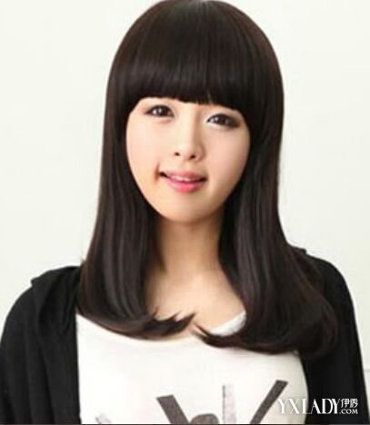 4.厚重的齐刘海造型设计可是最显女生十足的可爱甜美风的了,再配合时尚的棕红色染发设计与简单的中长发发梢内扣造型更添十足的清纯学院风。