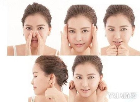 步骤2:从下巴开始,以左右手同时进行,首先是拇指抵住太阳穴,然后手指包裹住下巴做提拉。