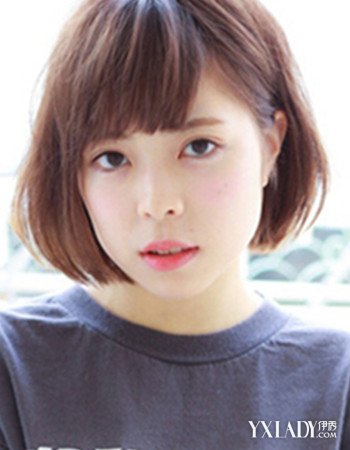 可爱的齐刘海具有减龄的作用,刘海也不是传统的齐刘海形式,这款发型的齐刘海与眉毛同齐,可以把女生精致的脸蛋显露出来,再搭配上蓬松的短烫发的造型,显得十分甜美可爱。