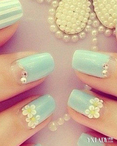 小清新风的美甲效果图,同样也深受女生们的喜爱!看那清纯感觉的淡淡绿色指甲,点缀白色花朵图案,清新中隐约散发出一股甜美可爱气息。