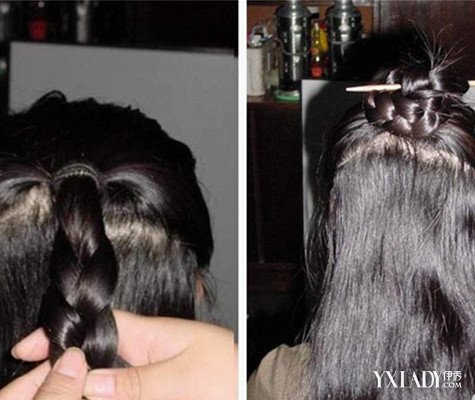 右:麻花辫盘到头顶用簪子或者是能够用的工详细固定,结实就能够了。