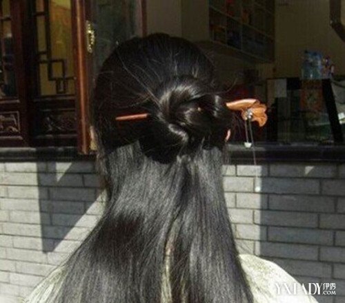 接下来就是要拿着一个簪子,再放在这个小辫的上方,再拿着小辫子绕在这个簪子上绕两圈再用手抓紧,不能让发髻松了.