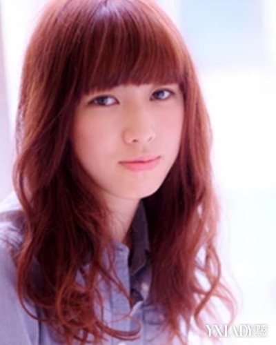 厚重的刘海发型显出女生萌萌的一面,而且齐刘海发型对于长脸的妹子来说显得特别修颜,将一款微卷发型染出时尚的玫瑰红色头发不仅有气质而且特别有个性。