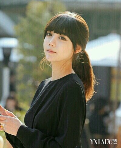 齐刘海的萌妹子扎起马尾来,显得特别的文静,淑女,因此,马尾不要扎得太高,就在中等偏下一点点的位置就好。
