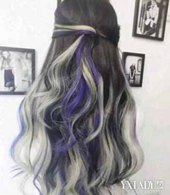 染发总能让人眼前一亮,色彩的视觉冲击给人带来的感观效果是不容小觑的,在黑色头发上挑染紫色和灰白色,个性又唯美,图中的MM一头漂亮的挑染长卷发,再在上面简单的diy,一个好看的卷发造型就出来了。